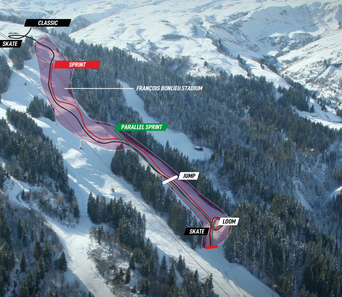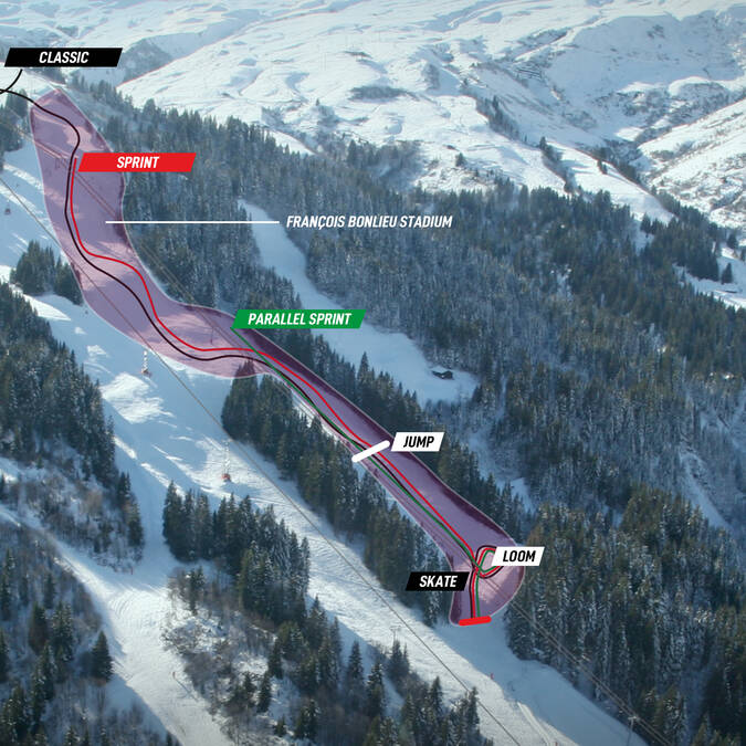 The François Bonlieu stadium is located in the Montjoie sector of the ski area and can be accessed by taking the Montjoie gondola or the Gorge gondola, followed by the Montjoie chairlift.